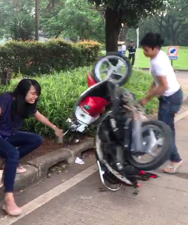 Sang pacar berusaha mencegah aksi Adi Saputra, tetapi gagal. Ia pun hanya bisa menangis dan menjerit lantaran motor kesayangannya hancur.
