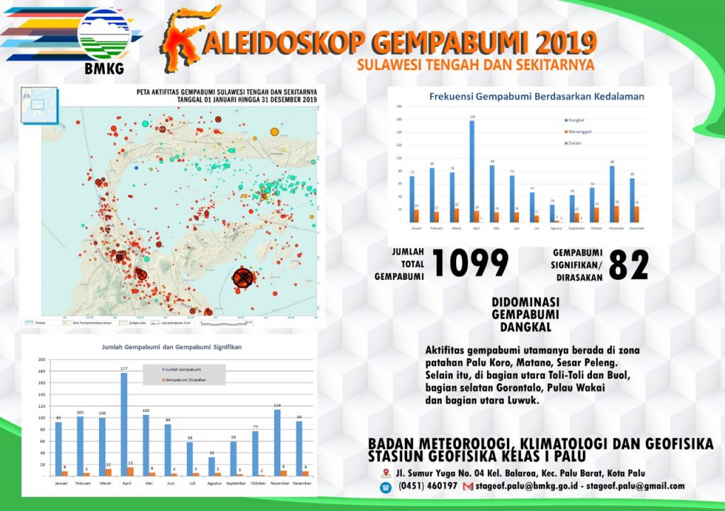 PALU – Sepanjang tahun 2019, Sulawesi Tengah (Sulteng) diguncang 1.099 kali gempa bumi dan 82 kali dirasakan masyarakat dengan berbagai magnitudo dan kedalaman.