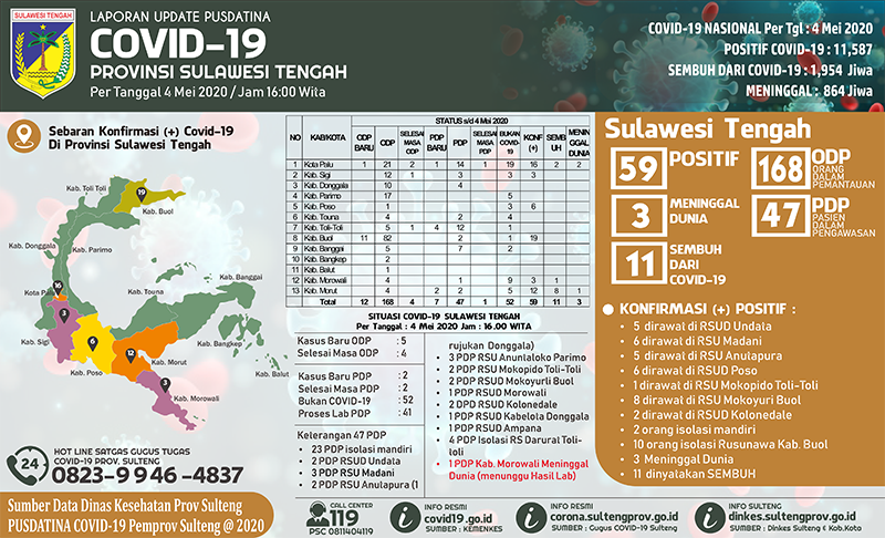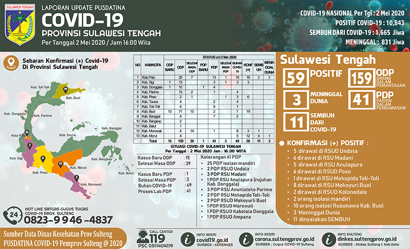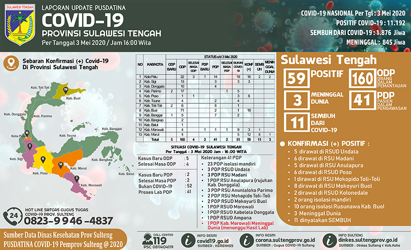 Merujuk pada data pusdatina yang di rilis hari ini Minggu, (3/5/2020) pukul 16.00 Wita, Kabupaten Buol masih memimpin dengan jumlah terbanyak, yakni 19 kasus, Kota Palu 16 kasus, disusul Kabupaten Morowali Utara 12 kasus, Kabupaten Poso 6 kasus, Kabupaten Sigi 3 kasus dan Kabupaten Morowali 3 kasus.