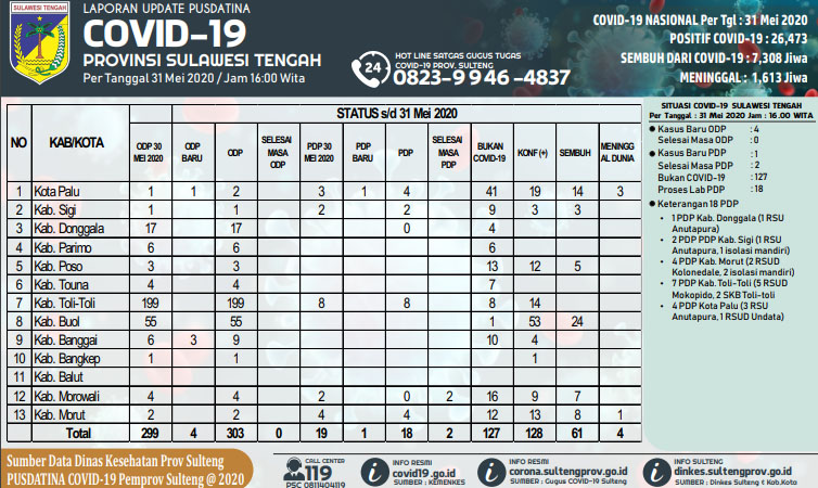 Data ini akan terus mengalami perubahan seiring perkembangan Covid-19 di Sulteng, sehingga diharap terus mengikuti update informasi data resmi terbaru Dinas Kesehatan Provinsi Sulteng. [***]