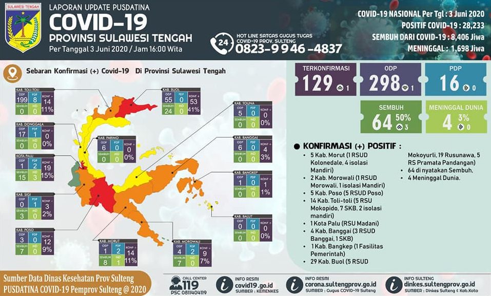 Dari 61 yang telah sembuh dan 4 orang meninggal dunia, masih ada 63 orang tengah menjalani isolasi dan perawatan, 1 orang di RSUD Undata, 4 orang di RSUD Kolonodale, 4 di RSUD Poso, 1 di RSU Lagaligo dari kabupaten Poso, 2 di RSU Anutapura (rujukan dari Poso), 1 di RSU Madani.