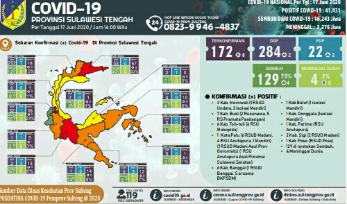Dari 125 yang telah sembuh dan 4 orang meninggal dunia, masih ada 43 pasien lagi sementara menjalani isolasi dan perawatan. Masing-masing 4 orang di Kabupaten Morowali (1 orang di RSUD Undata dan 3 orang isolasi mandiri).