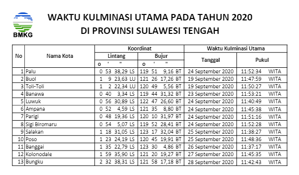 Berikut waktu Kulminasi Utama (Hari Tanpa Bayangan) Tahun 2020 di Wilayah Sulawesi Tengah :