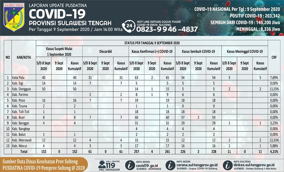 PALU – Hari ini Rabu, 9 September 2020 Pusdatina Corona Virus Disease Sulawesi Tengah melaporkan ada penambahan pasien terkonfirmasi positif sebanyak 4 orang. Sehingga total positif menjadi 261 kasus.