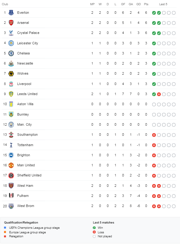 Kemenangan ini membawa Everton berada di puncak klasemen Liga Inggris dengan nilai enam dari dua kali bertanding. Sementara itu kekalahan ini membuat West Brom berada di posisi 20 atau peringkat buncit klasemen Liga Inggris.