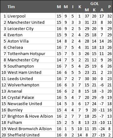 Berikut jadwal dan hasil Liga Inggris pekan ke-16 (tuan rumah disebut pertama, dalam WIB):