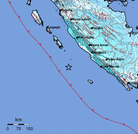 Parameter gempa menunjukkan pusat gempa berada 50 km barat daya Mukomuko dan berkedalaman 22 km.