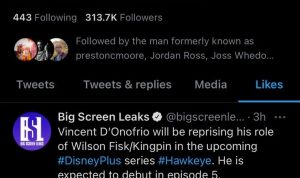 Dan menariknya, tweet Big Screen Leaks ini di-like oleh D’Onofrio. Yang alhasil membuat kita yakin kalau rumor kemunculan Kingpin di Hawkeye ini memanglah benar adanya.