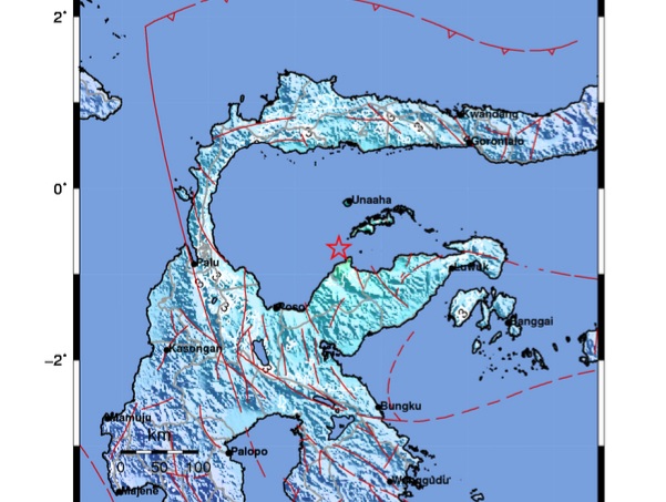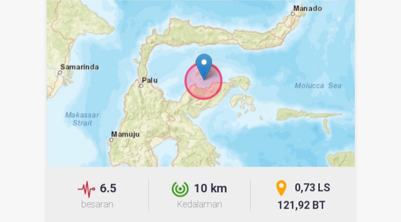 Parameter gempa menunjukkan pusat gempa terjadi 59 km timur laut Tojo Una Una dengan kedalaman 10 km. Titik gempa ini berada di laut.