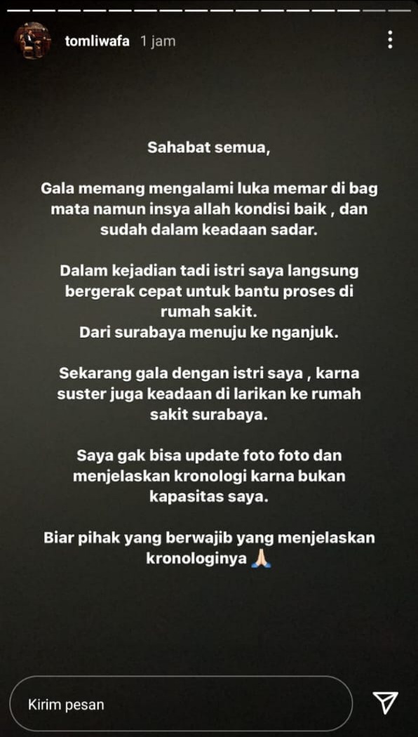 “Sahabat semua, Gala memang mengalami luka memar dibagian mata, namun Insya Allah kondisi baik, dan sudah dalam keadaan sadar”, tulis Tom Liwafa.
