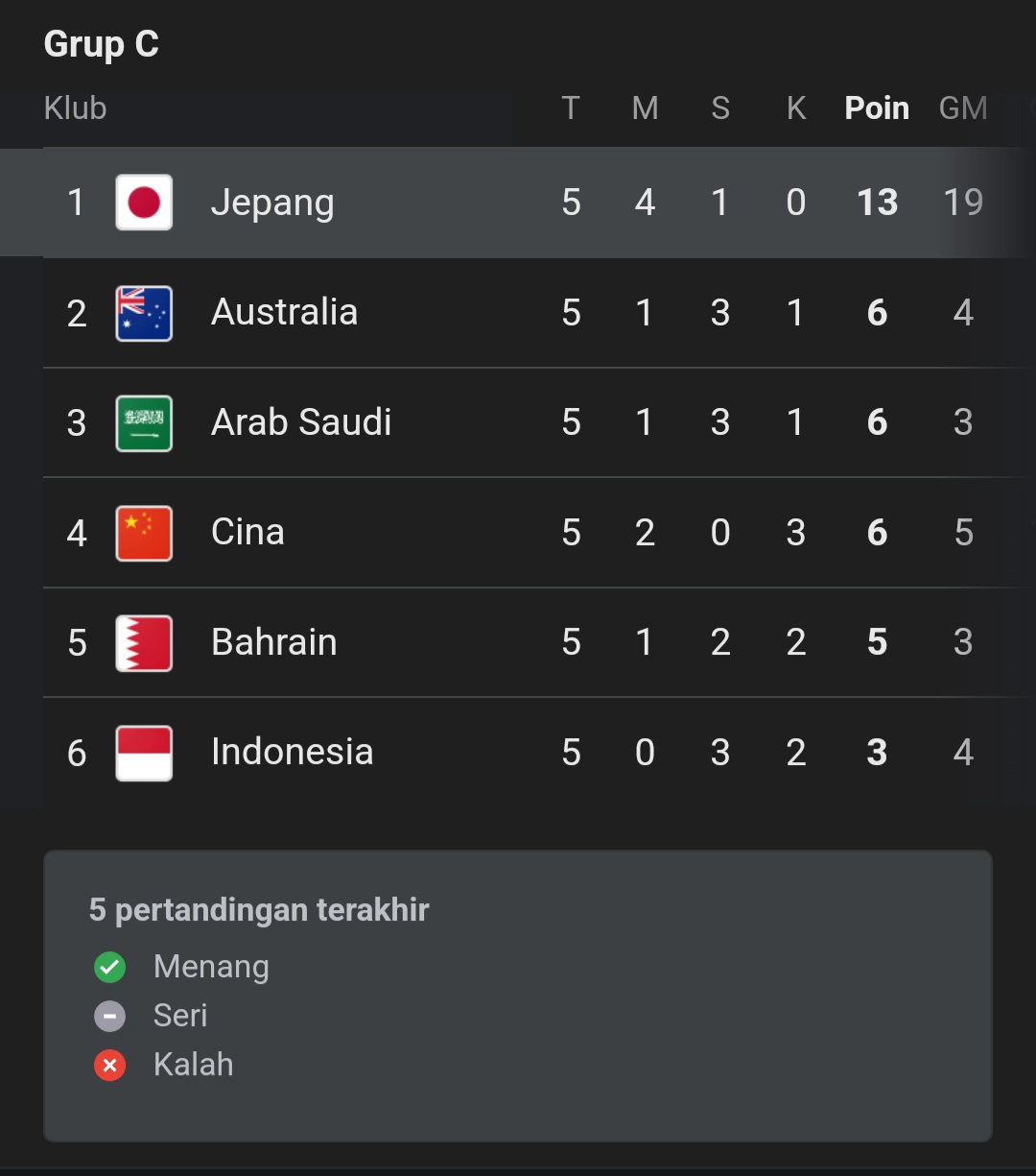 Meski berada di peringkat terakhir, Timnas Indonesia masih mempunyai peluang lolos ke Piala Dunia 2026 karena hanya tertinggal tiga poin dari Australia, Arab Saudi, dan China yang masing-masing berada di peringkat 2 hingga 4.