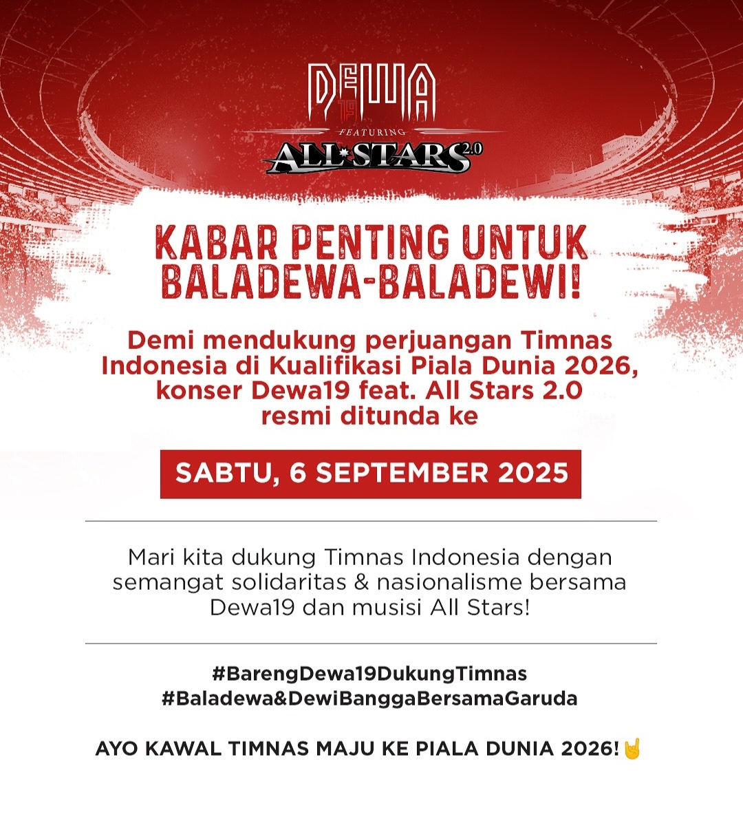 Jadwal Konser Dewa 19 Featuring All Stars 2.0 Ditunda ke 6 September 2025