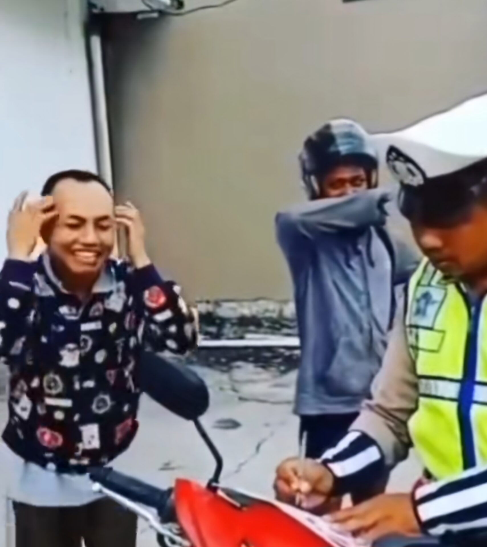 Polisi yang menilangnya tampak bingung, sementara video ini langsung menyebar dan mengundang tawa netizen.