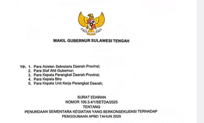 Pemerintah Provinsi Sulawesi Tengah (Pemprov Sulteng) menerbitkan Surat Edaran Nomor 100.3.4/1/SETDA/2025 yang berisi penundaan sementara kegiatan yang berkaitan dengan penggunaan Anggaran Pendapatan dan Belanja Daerah (APBD) 2025. Kebijakan ini dilakukan untuk efisiensi dan refocusing anggaran.