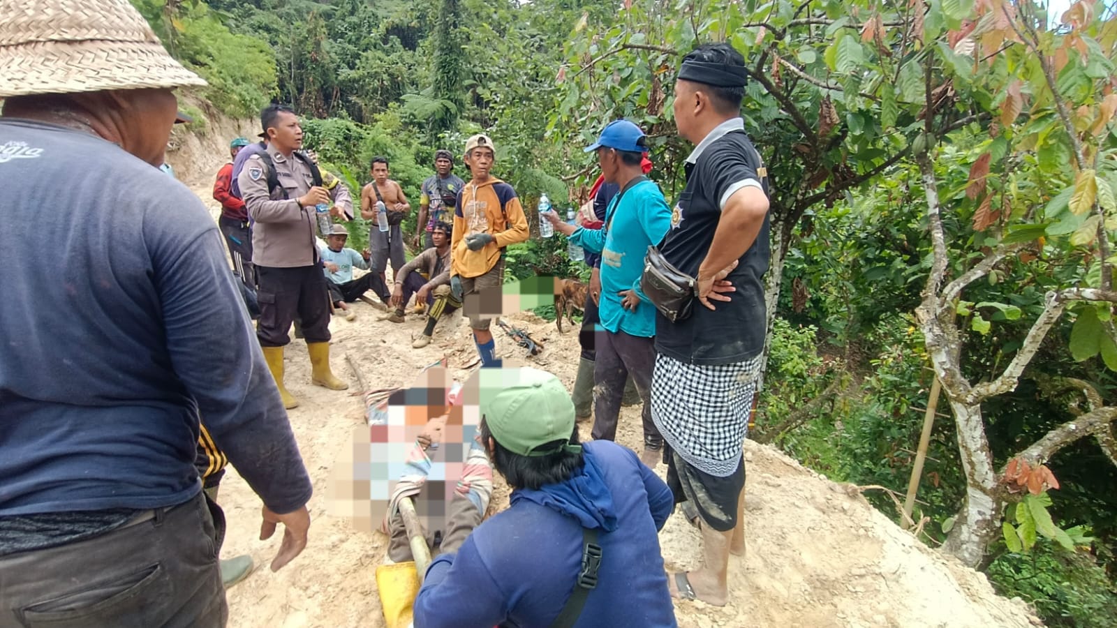 Seorang petani meninggal dunia akibat kecelakaan kerja saat melakukan aktivitas penebangan pohon di wilayah pegunungan Batu Intan Gunung Sari, Desa Tolai Barat, Kecamatan Torue, Kabupaten Parigi Moutong, Sulawesi Tengah, Selasa (3/2/2026). Korban diketahui bernama Made Yuliartana alias Pak Gilber (52), yang diduga meninggal dunia di lokasi kejadian setelah tertimpa pohon yang ditebangnya.