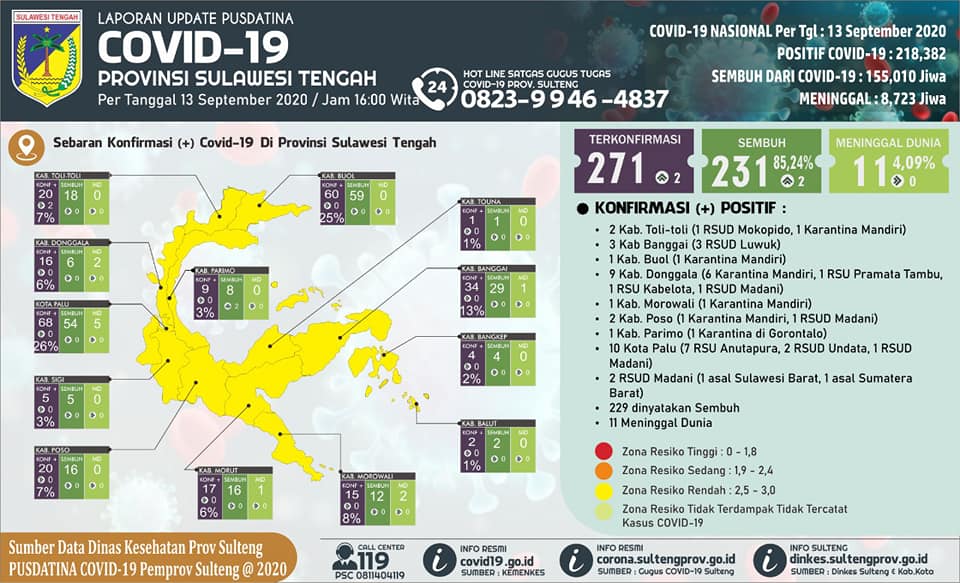 PALU – Pusdatina Corona Virus Disease Sulawesi Tengah Rabu, 16 September 2020 melaporkan ada