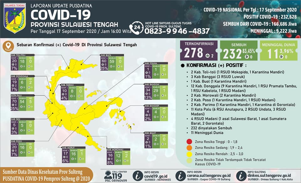 PALU – Pusdatina Corona Virus Disease Sulawesi Tengah Kamis, 17 September 2020 melaporkan ada