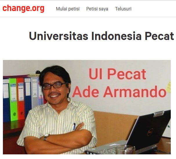 JAKARTA – Dipantau Infopena dari situs Change.org pada Rabu, (06/11/2019), Petisi “Universitas Indonesia Pecat Ade Armando” sudah ditandatangani sebanyak 23.307 orang. Jumlah itu kemungkinan akan terus bertambah.