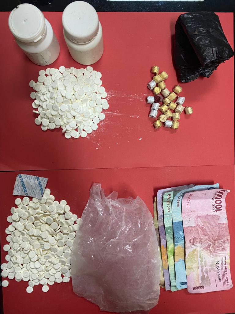 Selain ratusan THD, Polisi juga mengamankan 2 botol obat warna putih, 1 buah plastik bening warna putih, 1 buah plastik warna hitam, 1 buah sapu warna biru dan uang tunai Rp 186 ribu.