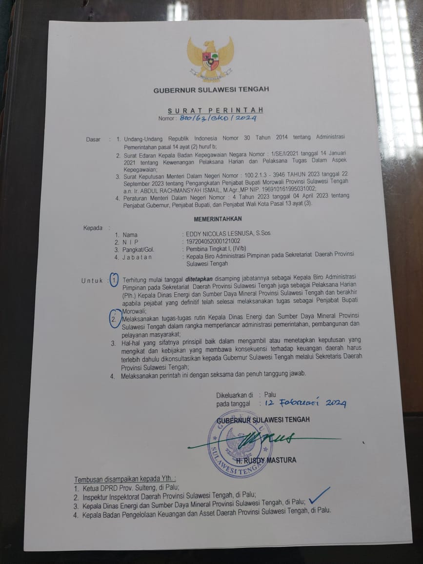 Gubernur Tunjuk Eddy N. Lesnusa sebagai Plh Kadis Esdm Sulteng